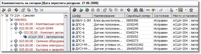 Раздел «Комплектность» — предназначен для учета сведений о ВС, его техническом состоянии, первоначальной комплектации, данных о заменах, истории эксплуатации как ВС в целом, так и отдельных комплектующих изделий |