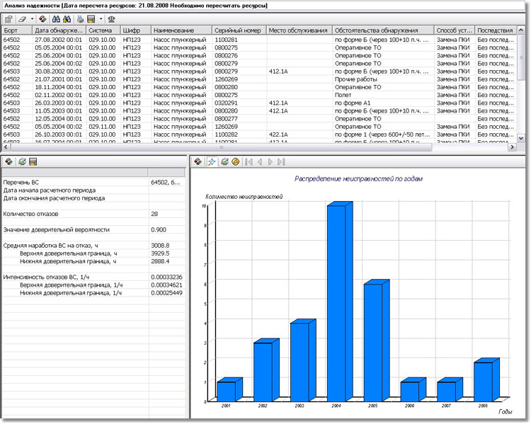 По данным об неисправностях определяются обобщенные количественные показатели надежности типа изделий, систем (подсистем) и агрегатов. Данные показатели выводятся суммарным итогом по годам эксплуатации или за определенный календарный период в виде графика. Кроме графического отображения показателей надежности в разделе формируются текстовые отчеты, а также обменные файлы для передачи данных об отказах в электронном виде.